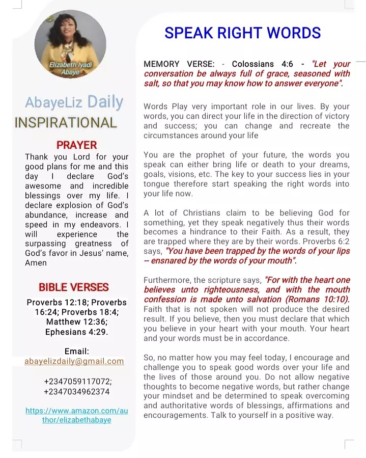AbayeLiz Daily Inspirational THE LIVING WORD MEMORY VERSE: - John 6:63 - "That is to say, The Spirit alone gives life. Human effort accomplishes nothing. And the very words I have spoken to you are spirit and life". (NLT) Jesus says, His Words had life. It has power, it has potential to bring anything meaningful to life in us. So, we must hold firmly to the Word of God because our whole life, our success, our peace, our joy, our achievements in life are all dependent on the Word. Child of God understand this very well, God's Word is not ordinary, it has life's essentials in it. It has inbuilt ability to turn evil to good, to make all your desires become a reality, The Word gives breakthrough, It gives good success. God's Word when set in motion quickens every dead things around you, and does wonders in one's life. Hebrews 4:12 tells us, "For the word of God is living and effective and sharper than any double-edged sword, penetrating as far as the sep...